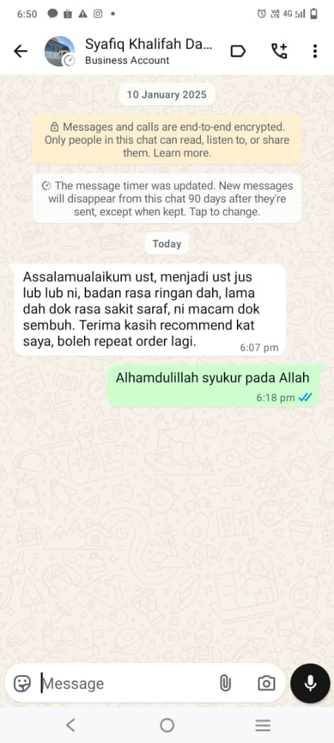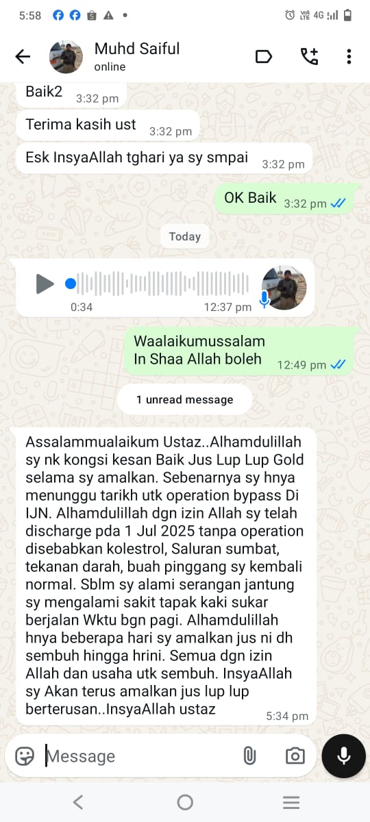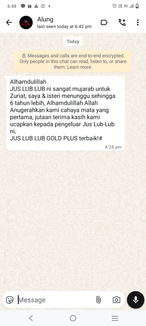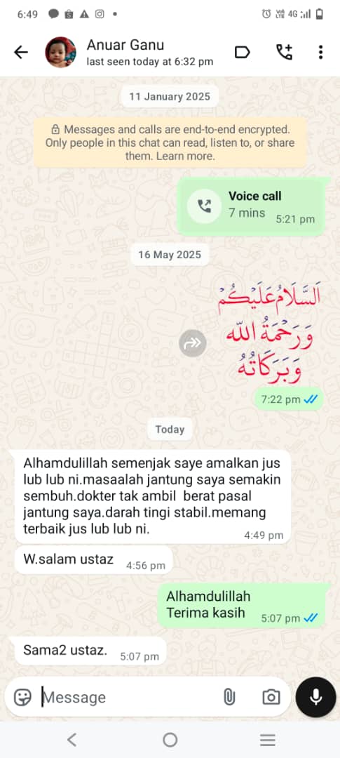 ”Saya Ustaz Amrin pengasas Jus LUB-LUB ini.. sangat syorkan anda mengamalkan minum Jus Lub-Lub ni bagi mengawal bacaan 4 serangkai anda. Kandungannya 100% organik, selamat in shaa Allah.. Sekaligus saya mendoakan kesembuhan & kebaikan untuk kita semua..”